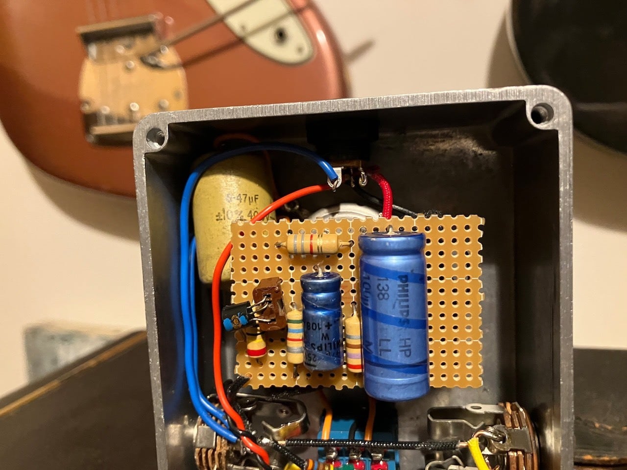 コンデンサは60年代MULLARD MUSTARD cap、抵抗は60〜70年代PIHER,ISKRA,MORGANITE等、ポットはAB,配線には60年代Radiospares、cornish.ケースはHAMMOND。