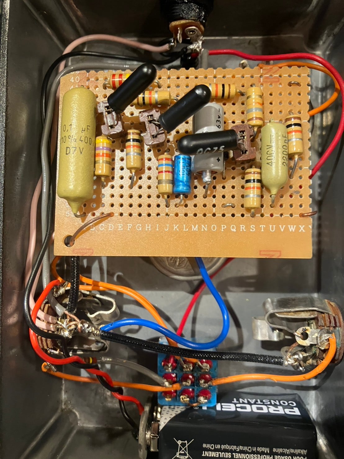 貴重なOC75ゲルマニウムトランジスタを3個使用したFUZZです。回路はSOLASOUNDのTONEBENDER MK3を基に製作しています。PCB基盤のTONEBENDER MK3がPTPだったらどうだろう?という発想とバンドで使いやすいFUZZが必要だったので作りました。